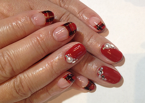 【ジェルネイル90分コース】秋冬らしいグレーと赤チェックネイル